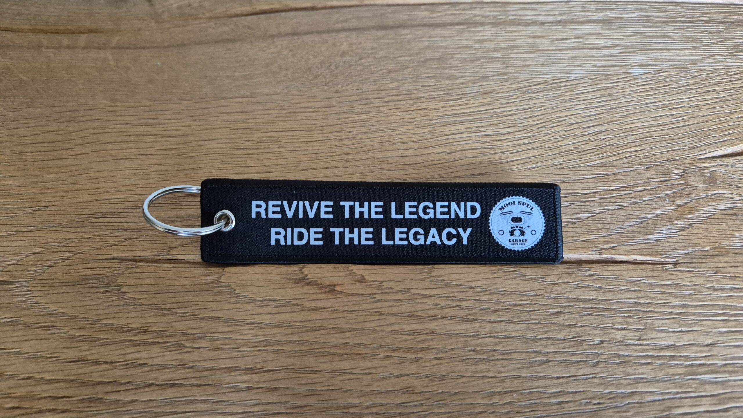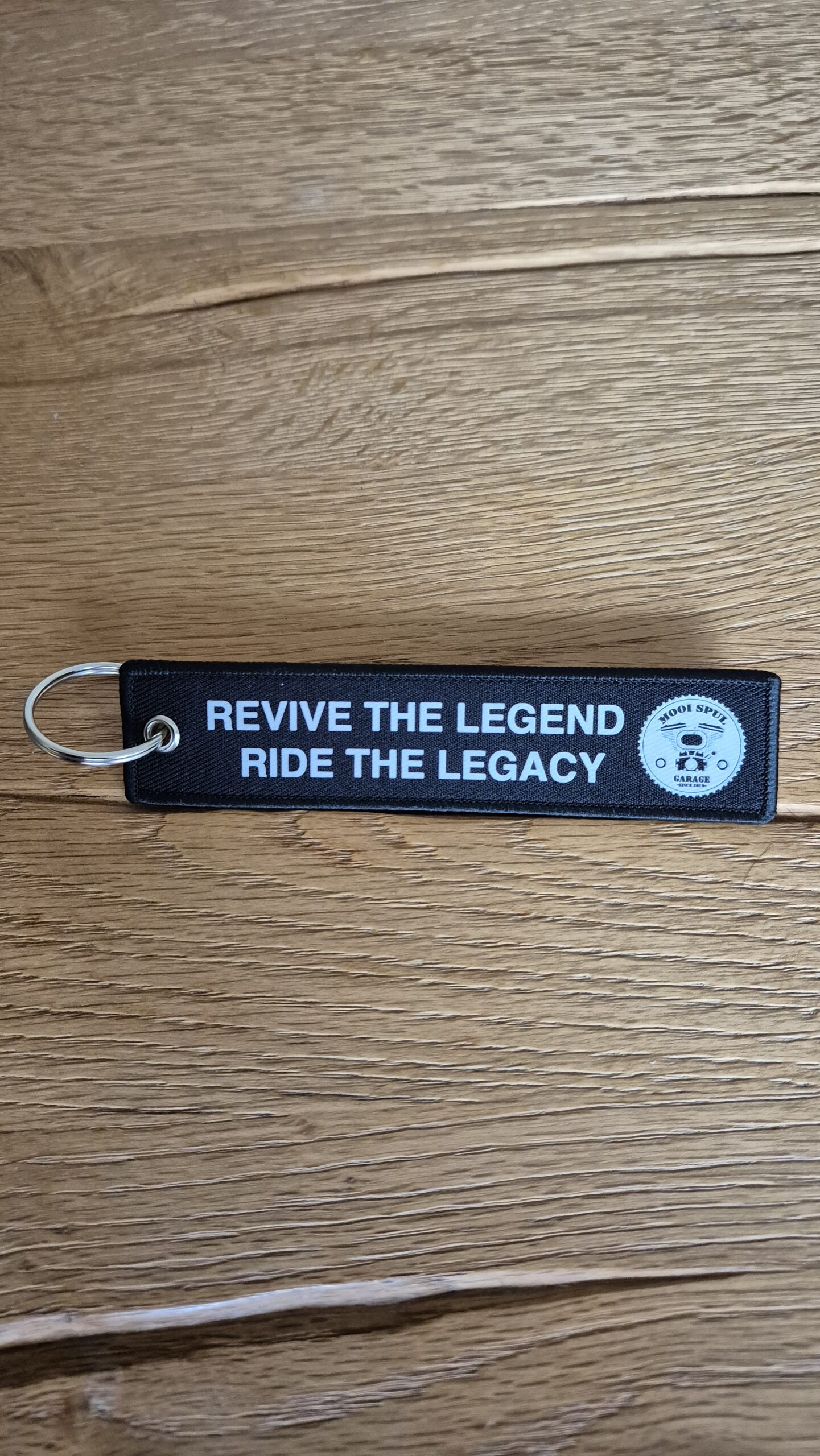 Mooi Spul Garage Sleutelhanger – Revive the Legend, Ride the Legacy